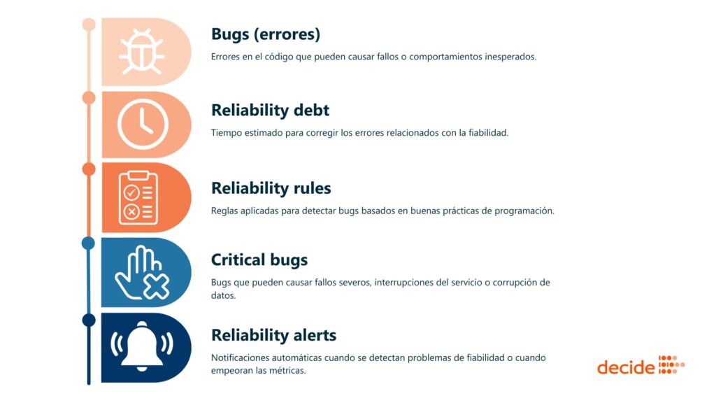 Evalúa la seguridad en una escala de A (mejor) a E (peor). Un bajo nivel de fiabilidad puede significar la presencia de errores o bugs que hacen que el software falle durante su uso. Se basa en las siguientes métricas:
