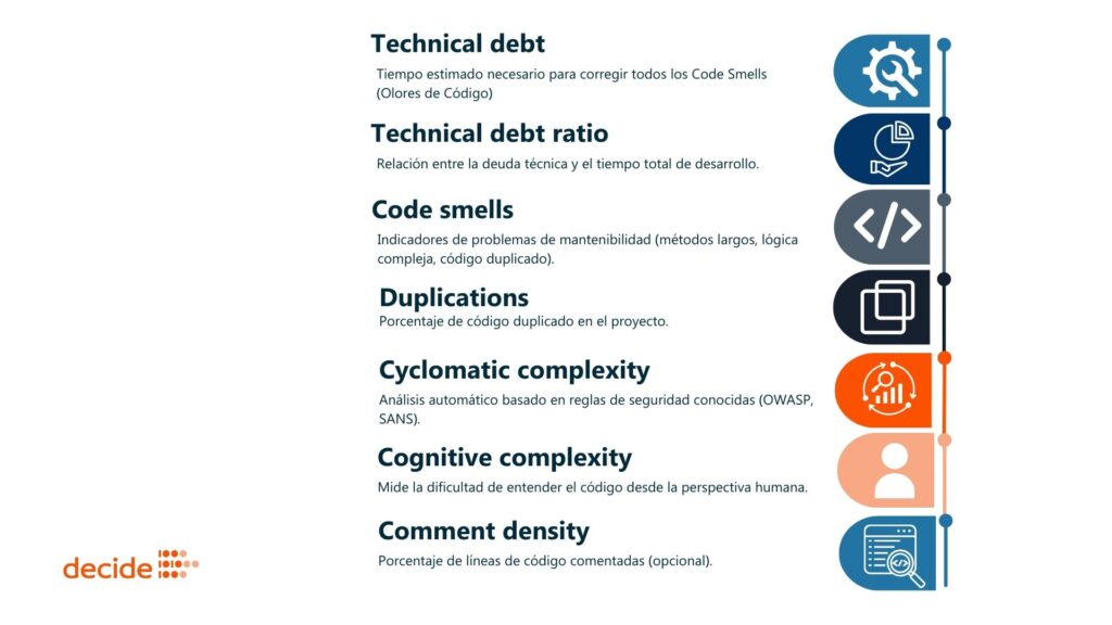 Para evaluar la calidad del códigoSonarQube agrupa estas issues en categorías de métricas, cada una tiene un enfoque específico.