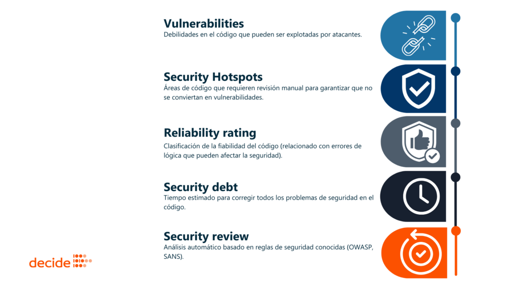 SonarQube analiza el código para encontrar posibles problemas que puedan ser explotados por un atacante, como inyecciones de SQL, desbordamientos de búfer, fallos de validación de datos, exposición de datos sensibles, uso inseguro de criptografía, dependencias vulnerables. Se basa en estándares como OWASP Top 10 y CWE.