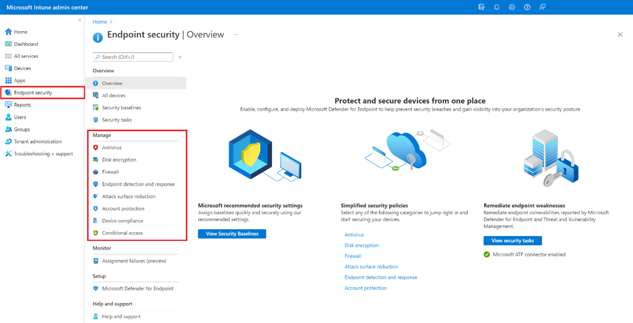 - Antivirus: Se centra en las configuraciones de antivirus para dispositivos administrados.